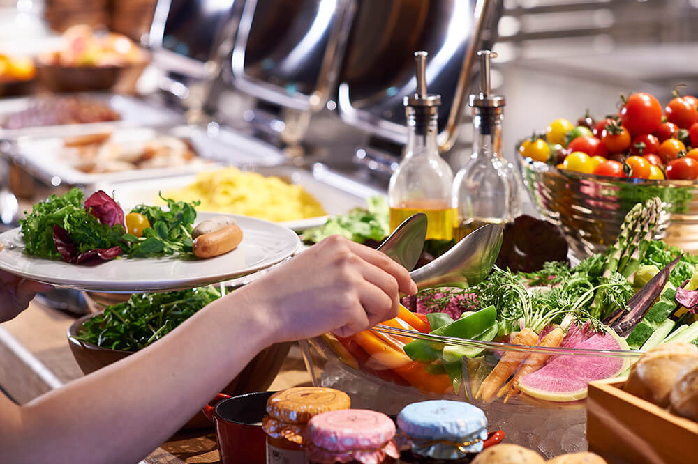 ブッフェはサラダはもちろん、パスタにデザート、パンなど、さまざまなラインナップから選べます。