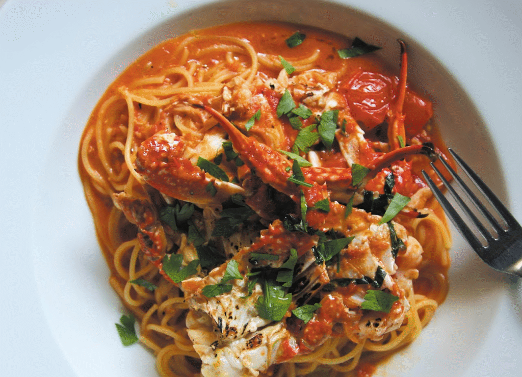 看板メニューの「ワタリガニとズワイガニのトマトソース」は、濃厚なカニの旨味とクリームが自家製生パスタに絡む多くの人が目当てに訪れる必図食べたい一皿です。