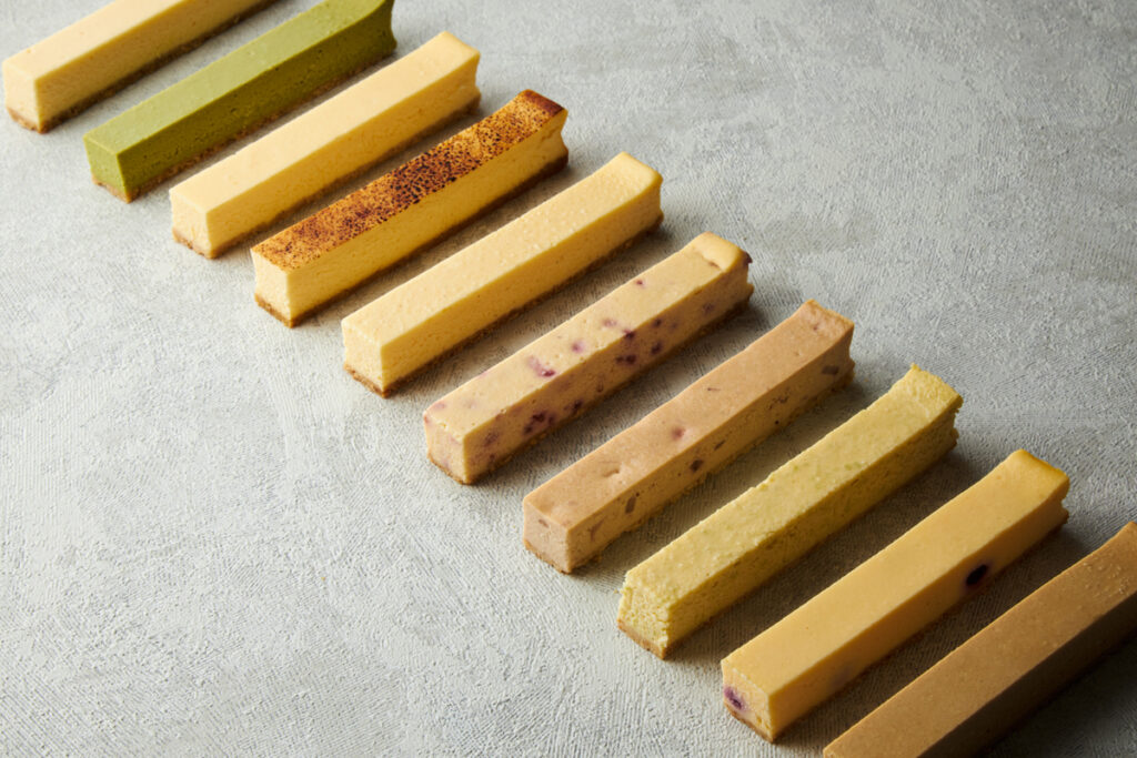 スティックチーズケーキはプレーン以外にもキャラメル、ずんだ、抹茶などたくさんのフレーバーがあり、好みの味をみつけるのも楽しい。