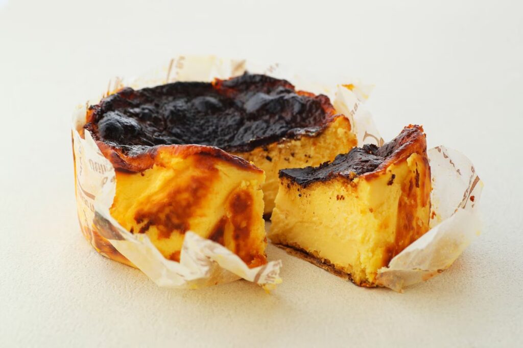 「バスクチーズケーキ」は、表面の焦げ目の香ばしさとチーズの濃厚さに加え、カスタードクリームのようなとろりとした食感が特徴です。